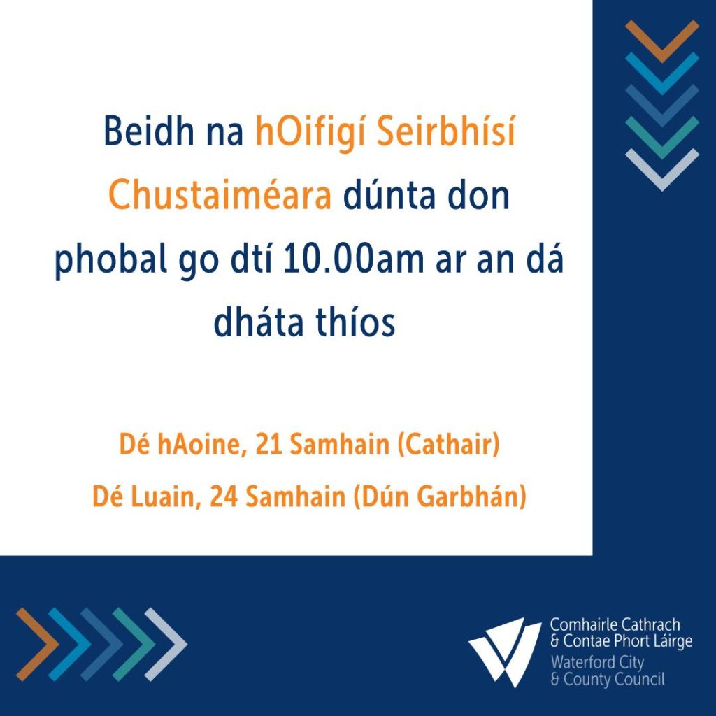 Beidh na hOifigí Seirbhísí Chustaiméara dúnta don phobal go dtí 10.00am ar an dá dháta thíos (oscailte de ghnáth ag 09.30am)